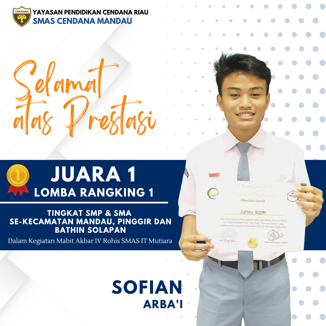 Selamat dan Bangga kepada : Sofian Arba’i yang berhasil meraih Juara 1 Lomba Rangking 1 Tingkat SMP & SMA Se-Kecamatan Mandau, Pinggir dan Bhatin Solapan dalam Kegiatan Mabit Akbar IV SMAS IT Mutiara. Category: PrestasiBy SMA Cendana MandauSenin, 7 November 2022Leave a commentShare this postShare with FacebookShare with TwitterShare with Google+Share with WhatsAppPost navigationPreviousPrevious post:Juara 3 Matematika Tingkat NasionalNextNext post:Pengumuman Siswa Elgible SNBP 2023Berita TerkaitJuara 3 Matematika Tingkat NasionalJumat, 4 November 2022Juara 1 PBB Pramuka Tingkat Kabupaten BengkalisMinggu, 30 Oktober 2022Juara 1 Musikalisasi Puisi Tingkat NasionalJumat, 28 Oktober 2022Juara 2 Band Akustik Tingkat Kecamatan Mandau-PinggirKamis, 27 Oktober 2022Juara 1 Tahfizh Quran Tingkat Provinsi RiauRabu, 26 Oktober 2022Juara 3 Tahfizh Quran Tingkat Kabupaten BengkalisRabu, 19 Oktober 2022